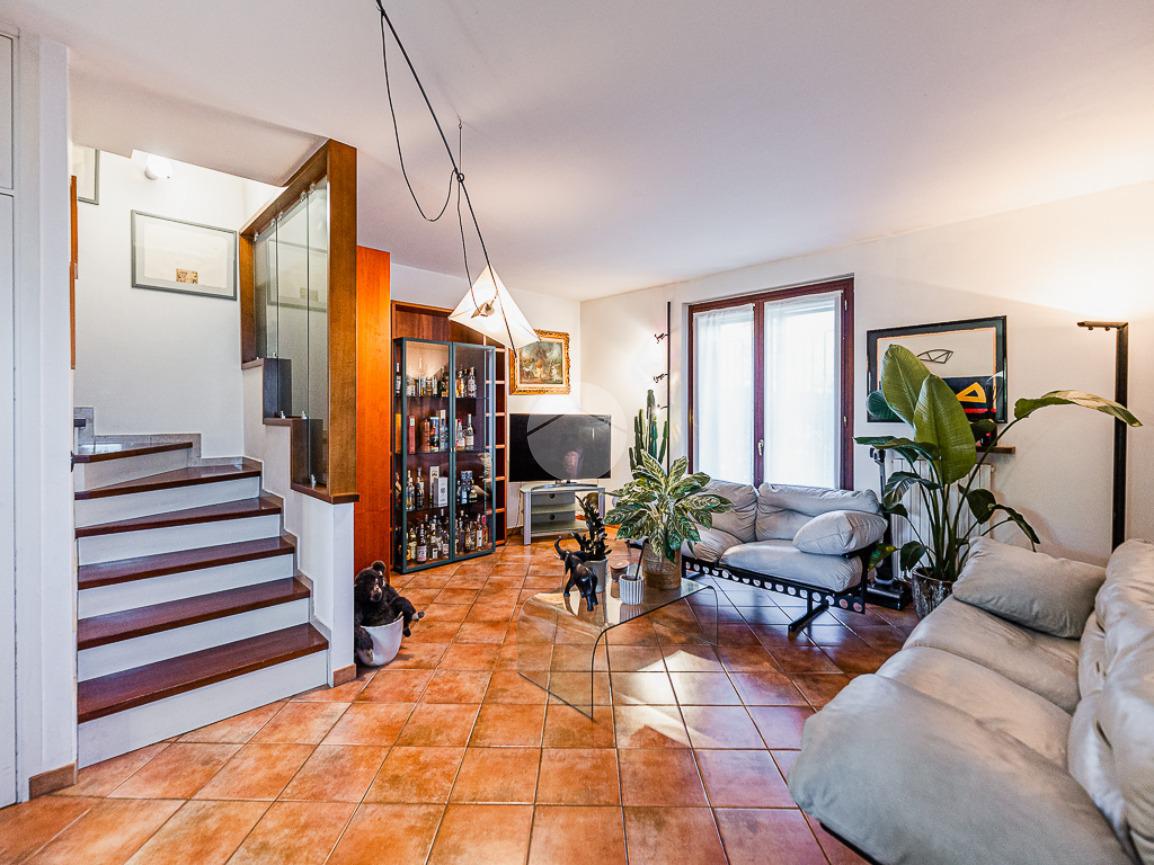 Entrando dalla porta principale al piano terra, ci accoglie un'ampia zona living open space, molto luminosa grazie alla presenza di due grandi porte finestre che affacciano sul giardino circostante di 150 mq, regalandoci un’atmosfera di relax e tranquillità.